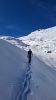 Beaucoup de sud de prévu dans les vallées aujourd’hui. Celle de la Maurienne semble assez protégée. Direction donc le Petit Arc qui decolle en S avec Rere qui a posé sa journée. On décide de passer par le Lac Noir pour profiter de la rando. Nous n’avons pas pris les chaussures d’alpi et nous allons vite le regretter puisque nous voilà les pieds dans la neige à 1800m. Arrivés à 2000m la progression jusqu’au Lac Noir devient lente et fatiguante. Il y a bcp plus de neige que nous le pensions. Nous voila à nous enfoncer parfois jusqu’à la cuisse sur certains passages. La neige est belle, presque immaculée et craque sous nos pieds. Nous décidons de ne pas faire de pause au lac et de continuer jusqu’a la crête pour se faire une idée du vent. Plus nous montons, plus le vent se fait sentir. Orienté ... E NE ? Whaaaat ?? Avec des rafales estimées a 25/30km/h ... Nous faisons la pause casse croute sous le vent de la crête pour évaluer la situation. Nous sommes tous les 2 fatigués de la montée dans la neige, nous décidons que nous ne monterons pas au Petit arc, nous avons repéré un petit mamelon 100m plus haut qui pourrait nous faire une belle piste de decollage, nous prenons la route sur la crête. Nous croisons des randonneurs qui nous indiquent avoir rebroussé chemin a cause de la neige. Le vent semble aussi fort la haut. Nous décidons d’arreter l’ascension avant même d’arriver au petit mamelon. Le vent est fort, pas tres bien orienté, la journée est deja entamée ... que faire ? Sachant que si nous decollons il faut absolument que nous passions la crête qui est a 2100m pour poser en vallee. Si on ne la passe pas ... on ne sait pas trop ou poser ... entre les arbres, les lignes électriques et l’inconnu qui nous attend. On commence la redescente a pied pour potentiellement decoller vers le Char de la Turche (plus bas, pas de pb de crête à passer, certainement moins de vent...) mais ... encore quelques kms de marche dans la neige... Nous hésitons. L’aerologie est prevu assez stable, un debut novembre, normalement pas de problème de brise ou de thermiques. Mais le sud dans les vallées et pourtant ce nord est que nous ressentons dégouline clairement du col derriere le grand arc... Je suis devenue un peu flipette de ces vols sauvages avec une aerologie incertaine le tout en susi et en string sans protection ...