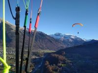 Vol avec Bruno. Bon déco. Un peu turbulent en l'air. La grande manche à air indiquait du vent venant de Sixt et les petites manches un vent opposé venant de la vallée. Comme j'ai regardé plutôt la grande, j'ai atterri dos au vent. Attérro sur mes 2 jambes quand même.